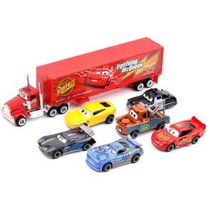 Conjunto de 7 peças Carros Disney Pixar Lightning McQueen Conjunto de 7 peças Carros Para curtir os personagens de Carros: Esses 7 carros convidam você a se lembrar do filme Carros 3. O cenário é composto por Lightning McQueen, o herói dos filmes “Carros”, Jackson Storm, Mate, Mack Uncle Truck, Sheriff, daniel “Danny” Swervez e Cruz Ramirez. Os amantes da saga poderão reviver cenas do filme autêntico. Essas réplicas idênticas aos carros dos filmes permitem criar histórias realistas e divertidas. O presente perfeito para crianças maiores de 3 anos e para amantes de “Carros”, Pixar ou Disney, e ideal para brincar ou expor! Características Marca: Disney Pixar. Conjunto: 7 peças. Modelo: Carros. Material: liga e plástico ABS. Fabricado sem substâncias tóxicas, como o BPA. Tamanho do carro pequeno: cerca de 8cm. Tamanho do caminhão: aproximadamente 24cm. Modelo realista, adequado para crianças brincarem a partir dos 3 anos.
