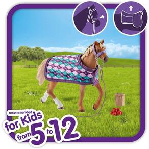 Explore o mundo animado de Lakeside com o Puro-Sangue Inglês com cobertor, um divertido e educativo brinquedo de Schleich! Este conjunto de 2.047" x 7.362" x 6.496" é autenticamente detalhado, e é ideal para horas de jogo imaginativo. Cobertor e cabresto removíveis! 4 peças.