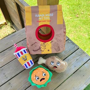 Material: pelúcia Cor: multicolorido Tamanho da embalagem: 24 x 12 x 10 cm Peso da embalagem: 0,5 kg Lista de embalagem: 1 conjunto x Pet Toy Interactive Fun: Este conjunto de brinquedos foi projetado para envolver seu cão com seus compartimentos de guloseimas escondidos. O conjunto incentiva seu cão a descobrir guloseimas, aprimorando suas habilidades de resolução de problemas e proporcionando entretenimento por horas. Material de pelúcia durável: feitos de tecido de pelúcia macio e durável, esses brinquedos são suaves para a boca e os dentes do seu cão, proporcionando uma experiência de mastigação satisfatória. Perfeito para brincadeiras individuais e interativas. Brinquedos multitexturizados: cada peça do conjunto oferece uma textura única, mantendo seu cão interessado e entretido. O hambúrguer, o osso e a xícara estridentes promovem hábitos saudáveis de mastigação e reduzem o comportamento destrutivo. Perfeitos para estimulação mental: projetados para cachorros e cães adultos, esses brinquedos fornecem estimulação mental ao desafiar seu cão a encontrar guloseimas escondidas. Ajuda a reduzir o tédio e a ansiedade de uma forma divertida e segura. Ótimo para todos os cães: ideal para cães de todos os tamanhos, este conjunto de brinquedos interativos é perfeito para cães que adoram mastigar e jogar. É ótimo para fortalecer seu vínculo com seu cão por meio de brincadeiras e exercícios.