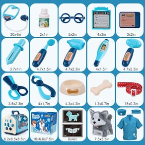 Este conjunto de brinquedo veterinário vem com acessórios completos, incluindo um cão de brinquedo interativo elétrico (pilhas não incluídas), um transportador para cães, ferramentas médicas de brinquedo variadas, como estetoscópio, seringa, termômetro e outras ferramentas que permitem que crianças finjam ser médicas e cuidem de seu cão de estimação. - Kit veterinário para crianças com cachorro de brinquedo: este conjunto de brinquedo veterinário para crianças vem com acessórios completos, incluindo um cachorro de pelúcia interativo elétrico (sem pilhas), uma fantasia de médico, um transportador de cães e um conjunto completo de brinquedos de ferramentas médicas. Há estetoscópio, seringa, termômetro e outras ferramentas que podem fazer com que as crianças sejam médicas e cuidem de animais de estimação. As crianças gostariam de passar mais tempo brincando e aprendendo habilidades sociais, resultando em horas de diversão - Brinquedo interativo eletrônico para cães: cães de brinquedo podem andar, latir, abanar o rabo e acenar com a cabeça como um cão de verdade faria. Basta colocar as pilhas e ligá-las, e o cão husky ficará vibrante. Quando você bate suavemente na cabeça do cão de brinquedo, o brinquedo para cães emite um som de latido. Isso faz com que as crianças se divirtam mais. Observação: o cão de brinquedo Husky precisa instalar 2 pilhas AA na barriga do filhote (não incluídas) - Kit médico de brincadeira para crianças: Uau! Fantasias de médico maravilhosas e brinquedos completos de ferramentas veterinárias. Este conjunto de brinquedos médicos possui ferramentas médicas suficientes para seus filhos fingirem desempenhar o papel de médicos. Por exemplo, use um termômetro para medir a temperatura corporal de um cão e usar um estetoscópio para verificar o cão. Além disso, os cães também podem ser cuidados, tratados e alimentados. deixe as crianças vestirem uma fantasia de médico para cuidar do cachorrinho - DIVERSÃO EDUCACIONAL PRÉ-ESCOLAR: Deixe as crianças se envolverem em encenações imaginativas e educativas usando brinquedos médicos realistas e fantasias de médico! Aprenda como cuidar dos animais de estimação brincando, promovendo amor e responsabilidade. Ferramentas médicas realistas desenvolvem coordenação olho-mão e habilidades de resolução de problemas. Este conjunto veterinário é um ótimo brinquedo educativo para crianças a partir de 3 anos de idade - Conjunto de brinquedo portátil e resistente: este cão de brinquedo é feito de materiais premium, o que o torna um ótimo companheiro para crianças. Uma bolsa de transporte para cães com uma alça foi especialmente projetada e pode caber facilmente em todo o conjunto. As crianças podem levá-los para qualquer lugar. A superfície do conjunto de brinquedos é muito lisa, o que pode proteger as crianças ao brincar. É um ótimo brinquedo educativo para crianças, meninos, meninas, 3, 4, 5, 6+ no dia das crianças, brincadeiras, sala de aula, presentes de Natal e aniversário de Halloween
