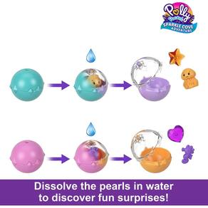 - O conjunto Polly Sparkle Cove Adventure Treasure Chest é preenchido com "ouro", o conjunto inclui 2 micro bonecas, 2 pérolas dissolúveis (com surpresas dentro), 4 animais, 4 pedras preciosas e 4 acessórios.