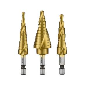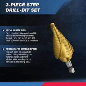 Conjunto de Brocas Helicoidais - Bit de passo premium: cada unibit é construído em aço industrial de alta velocidade com um revestimento de nitreto de titânio para durabilidade e resistência para perfurar e perfurar furos limpos em materiais como plástico, alumínio, madeira, cobre, aço inoxidável e outros tipos de chapa metálica. - Broca de passo para metal: com uma ponta de ponto dividido que acelera a velocidade de corte enquanto evita que o ângulo se afaste da linha central do furo, fazer furos em metal é rápido, eficiente e limpo. - DESIGN ESPIRAL: O design ranhurado espiral de duas flautas rebarbas lascas, poeira e detritos para folga e corte suave. Com 31 tamanhos de passos, cada orifício feito com estas brocas de passo será preciso. - Mudança rápida: a haste hexagonal de 0,6 cm facilita o uso de interruptores de brocas de passo convenientes e é compatível com ferramentas elétricas prontas para impactos. - INCLUI: Cada conjunto de brocas vem com 3 brocas combinadas de 31 tamanhos para adicionar ao seu arsenal de perfuração: broca de 13 degraus (1/8, 5/32, 3/16, 7/32, 1/4, 9/32, 5/16, 11/32, 3/8, 13/32, 7/16, 15/32, 15/32, 1/32, 15/32, 1/32, 15/32, 1/32, 15/32, 1/32, 15/32, 1/32, 155 cm (2") Broca de 6 passos (3/16, 1/4, 5/16, 3/8, 7/16, 1/2") e broca de 12 passos (3/16, 1/4, 5/16, 3/8, 7/16, 1/2, 9/16, 5/8, 11/16, 3/4, 13/16, 7/16, 7/16, 7/16, /20.3 cm).