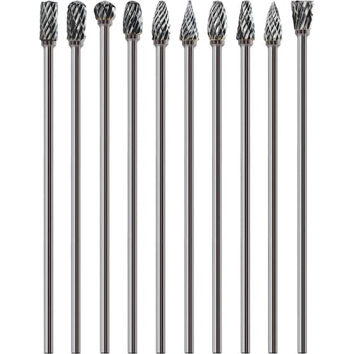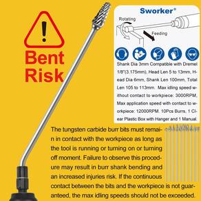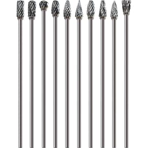 Sworker Kit de conjunto de 10 peças de carboneto de tungstênio longo, o pacote inclui: 10 peças de conjunto de brocas longas de carboneto de haste de 3 mm compatível com Dremel 1/20.3 cm (3,175 mm), comprimento total de 11 cm, diâmetro da cabeça 6 mm, 1 caixa de plástico com fenda com gancho e 1 manual. Formas de cabeça: cilíndrica de corte final, cilíndrica de nariz esférico, bola, oval, árvore de nariz esférico, árvore, chama, cone, cone invertido. Material da cabeça: Carboneto de tungstênio. Dureza da cabeça: HRA90. - Conjunto de 10 brocas longas de carboneto de haste de 3 mm compatível com a coleção Dremel de 3,175 mm, comprimento total de 11 cm, diâmetro da cabeça de 6 mm, 1 caixa de plástico com fenda com gancho e 1 manual. - Risco dobrado! As brocas de carboneto de tungstênio devem permanecer em contato com a peça de trabalho enquanto a ferramenta estiver funcionando, ligando ou desligando no momento. Não observar este procedimento pode resultar em flexão da haste da rebarba e um maior risco de lesões. Se o contato contínuo entre as brocas e a peça de trabalho não for garantido, as velocidades máximas de marcha lenta não devem ser excedidas. - Perfeito para áreas apertadas e difíceis de alcançar do que discos de moagem. O corte duplo produz um acabamento mais fino do que o corte único e reduz o tamanho das lascas. - Brocas de carboneto de haste longa perfeitas para rebarbar, suavizar, portar, ferro fundido, aço, alumínio, cabeça do cilindro, admissão do motor, coletor de escape. - Muito afiado, agressivo, resistente, bem equilibrado e durável. Substituição sem devolução por 5 anos.