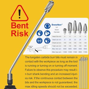 - Bent Risk! As brocas de carboneto de tungstênio devem permanecer em contato com a peça enquanto a ferramenta estiver funcionando ou sendo ligada ou desligada no momento. A não observância deste procedimento pode resultar na flexão da haste da rebarba e no aumento do risco de ferimentos. Se o contato contínuo entre as brocas e a peça não for garantido, as velocidades máximas de marcha lenta não devem ser excedidas.