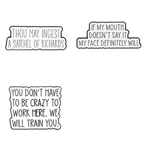 Material: liga. Quantidade: você receberá todas as peças em quantidade igual à primeira foto principal. Mostre Humorous Quote DesignEste conjunto de broches apresenta frases criativas como “Se minha boca não diz isso, meu rosto definitivamente vai”, adicionando sarcasmo e humor às suas roupas ou acessórios. Material de liga durável Feitos de liga de alta qualidade com acabamento liso em esmalte, esses pinos de lapela são robustos, leves e resistentes ao desbotamento para uso duradouro. Uso versátil. Perfeitos para decorar mochilas, jaquetas, blusas ou chapéus, esses alfinetes de blusa servem como acessórios elegantes para roupas casuais, festas e reuniões sociais. Compacto e leve. Pequeno e fácil de colocar, cada crachá é confortável de usar e transportar, permitindo que você expresse sua individualidade sem esforço. Divertidos e expressivos. Esses broches com frases espirituosas são ideais para mostrar personalidade, iniciar conversas e adicionar um toque divertido à moda cotidiana.