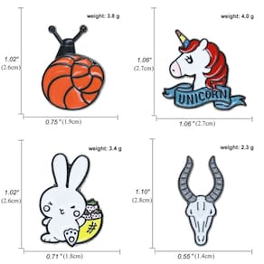Material: liga Tamanho: 1,8 x 2,6 cm Peso: 14 g Quantidade: você receberá toda a quantidade de peças da mesma imagem principal. Mostre desenhos animados exclusivos. Inclui broches de unicórnio, coelho, caracol e caveira com acabamento colorido em esmalte, adicionando um toque divertido e elegante às roupas. Material de liga premium Feito de liga durável com revestimento de esmalte liso, leve, mas forte, adequado para uso diário. Uso versátil Alfinetes de blusa perfeitos para jaquetas, camisas, vestidos, mochilas e chapéus, aprimorando a aparência casual e moderna. Unissex e juvenil Projetado para crianças, adolescentes, mulheres e homens que gostam de alfinetes de lapela esmaltados criativos e emblemas modernos. Seguro e fácil de usar. Cada alfinete de broche possui um fecho confiável, garantindo que permaneça no lugar e, ao mesmo tempo, seja simples de colocar e remover.