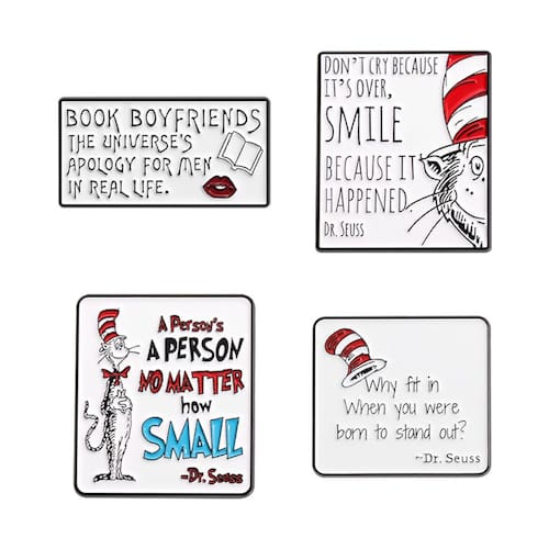 Material: liga Tamanho: 3,5 x 1,8 cm Peso: 27 g Quantidade: você receberá todas as peças em quantidade igual à primeira foto principal Mostre Conjunto de 4 broches de citações do Dr. Seuss: inclui quatro alfinetes divertidos e inspiradores com citações famosas do Dr. Seuss, como “Não chore porque acabou, sorria porque aconteceu” e “Por que se encaixar quando você nasceu para se destacar”. Material de liga de alta qualidade: feitos de liga durável, esses broches são feitos para durar, garantindo que seu design vibrante permaneça intacto com o uso regular. Acessório de moda versátil: perfeitos para adicionar um toque pessoal e motivador às suas jaquetas, blusas e bolsas, esses alfinetes são ideais para uso diário ou eventos casuais. Leve e confortável: pesando apenas 27 g, cada pino é fácil de usar sem causar desconforto ou volume. Ideal para presentes motivacionais: esses broches exclusivos e atenciosos são perfeitos para quem aprecia citações motivacionais e a sabedoria do Dr. Seuss, adicionando estilo e positividade a qualquer roupa.