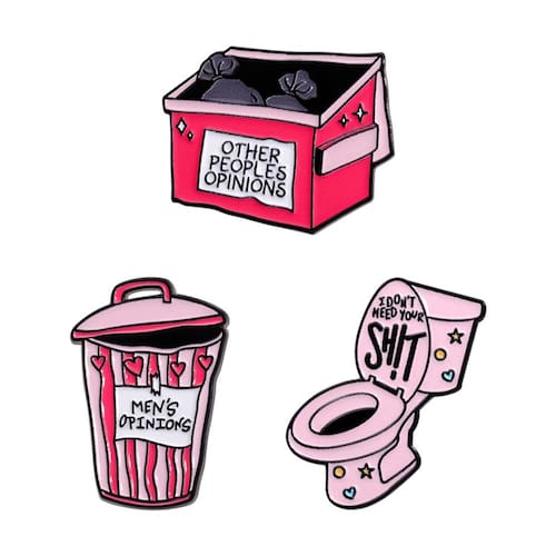 Material: liga Tamanho: 2,9 x 2,3 cm Peso: 16 g Quantidade: você receberá todas as peças em quantidade igual à primeira foto principal Mostre Humorous Quote Design — Inclui 3 broches esmaltados em forma de lata de lixo, caixa e vaso sanitário com textos em negrito como “Opiniões de outras pessoas” e “Não preciso de suas coisas”. Material de liga durável — Feito de liga de alta qualidade com acabamento esmaltado, garantindo superfície brilhante, cores brilhantes e resistência ao desbotamento. Acessórios versáteis — Esses alfinetes de blusa e broche funcionam bem como crachás de lapela para decorar jaquetas, camisas, mochilas ou chapéus. Estilo divertido de desenho animado — Desenhos peculiares de esmalte com tons de rosa e texto humorístico adicionam personalidade, perfeitos para amantes da moda casual e moderna. Compacto e leve — cada pino mede cerca de 2,9 x 2,3 cm, peso total de 16 g, confortável de usar e fácil de transportar diariamente.