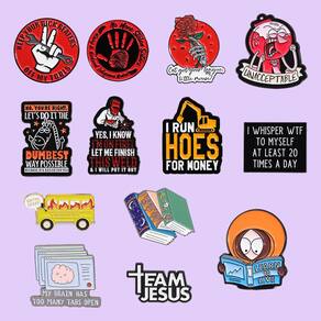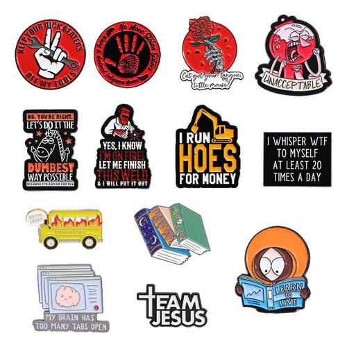 Material: liga Tamanho: 3,2 x 3,5 cm Peso: 70 g Quantidade: você receberá todas as peças em quantidade igual à primeira foto principal. ShowCreative Set — Possui broches esmaltados com citações engraçadas, gráficos ousados em vermelho e preto, ícones de desenhos animados, livros, cérebro, ônibus e designs motivacionais. Liga e esmalte — Feito de liga de alta qualidade com acabamento em esmalte colorido, garantindo cores vibrantes, bordas lisas e durabilidade duradoura. Acessórios — Funcionam como alfinetes de blusa, crachás de lapela ou decorações elegantes para jaquetas, camisas, chapéus, bolsas e mochilas. & Bold Style — designs divertidos e atraentes, perfeitos para estudantes, adolescentes e jovens adultos que amam acessórios expressivos e engraçados. E leve — Cada alfinete mede cerca de 3,2 x 3,5 cm com peso total de 70 g, fácil de usar, transportar e misturar com roupas do dia a dia.