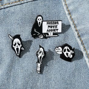 Material: liga. Tamanho: 1,8 x 2,8 cm Peso: 19 g Quantidade: você receberá toda a quantidade de peças da mesma imagem principal. Tema da máscara ShowHorror — inclui vários designs, como rosto gritando, detalhes em faca e texto “Horror Movie Addict”, adicionando um toque gótico assustador. Material de liga durável — Feitos de liga forte com detalhes de esmalte, esses broches são leves, duradouros e resistentes ao uso diário. Estilo versátil — funciona como alfinetes de blusa, alfinete de lapela ou crachá para jaquetas, casacos, mochilas e chapéus, adequados tanto para homens quanto para mulheres. Compacto e ousado — Cada broche mede cerca de 1,8 x 2,8 cm, pequeno o suficiente para uso diário, mas com detalhes impressionantes inspirados no terror. Perfeito para ocasiões — Ótimo acessório para Halloween, cosplay, moda gótica, shows ou como peça marcante para roupas de rua alternativas.