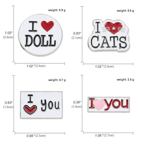 Material: liga. Tamanho: 2,6 x 2,6 cm Peso: 20HT: g Quantidade: você receberá todas as peças em quantidade igual à primeira foto principal. O conjunto temático ShowLove inclui 4 broches esmaltados com designs encantadores: “I Love Doll”, “I Love Cats” e dois padrões “I Love You”. Construção em liga — Fabricada em liga de alta qualidade com acabamento esmaltado suave, garantindo brilho duradouro e resistência ao desgaste. Opções de estilo — Tamanhos compactos (aproximadamente 2,6 x 2,6 cm) os tornam ideais como alfinetes de blusa, broche de lapela ou crachá decorativo para roupas e acessórios. Acessórios de moda — Adequados para homens, mulheres e adolescentes, adicionando um toque divertido e divertido às roupas casuais ou do dia a dia. Para várias ocasiões — Ótimos para uso diário, festas temáticas, passeios casuais ou simplesmente expressar amor por bonecas, gatos ou amigos.