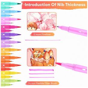 PINCEL FANTÁSTICO E FINELINER, MARCADORES DE PONTO DUPLO: Esta caneta dupla pode r sua imaginação e criatividade. A ponta da caneta pincel pode funcionar bem para letras à mão, livros para colorir, autógrafos, design, projetos de arte e coloração em grandes áreas. A ponta fina da caneta pode ser usada para desenhar, rabiscar, escrever e livros de colorir complexos. E este conjunto vem com 4 lindas folhas para colorir, você pode criar e colorir imediatamente.