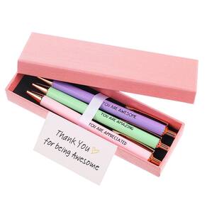Lista de embalagem: caixa de presente de 1 unidade Cartão “Obrigado por ser incrível” 3 peças de caneta esferográfica Tamanho do produto: caneta única: 14 x 1 cm/5,51 x 0,39 polegadas Cartão: 7 x 4 cm/2,75 x 1,57 polegadas Cor do cano da caneta: roxo, rosa, verde Cor do refil: preto Material: alumínio Características: 1 . Mostre sua gratidão e admiração com nosso conjunto de canetas Fancy, projetado especificamente para expressar apreço e respeito. Seja para seu chefe, colegas de trabalho ou professores, essas canetas são a maneira perfeita de reconhecer seu trabalho árduo e dedicação. A cada golpe, diga a eles que seus esforços são reconhecidos e valorizados. 2. A construção leve e a aderência confortável dessas canetas permitem longos períodos de escrita sem cansaço manual, perfeitas para anotadores e escritores ávidos . ? SERVIÇO Nós fornecemos produtos de alta qualidade e a melhor experiência do cliente, não hesite em nos contatar! - Citações positivas gravadas: cada caneta esferográfica em nosso sofisticado conjunto de canetas apresenta uma citação cuidadosa delicadamente gravada em sua superfície elegante, incluindo “Você é incrível”, “Você é incrível” e “Você é apreciado” gravada em cada caneta. Nossas canetas motivacionais a granel animam você e o lembram de manter uma atitude positiva em relação à vida, permitindo que você reúna coragem para enfrentar dificuldades e desafios. - Canetas de escrita lisas: a tinta preta com ponta de 1,0 mm de nossos conjuntos de canetas esferográficas motivacionais fornece linhas definidas e reduz os saltos ao escrever. Essas canetas lisas escrevem suavemente em vários tipos de papel e a tinta não penetra no papel, proporcionando uma experiência de escrita confortável e um conteúdo delicado. - Embalagem requintada: apresentado em uma elegante caixa rosa com um cartão escrito com “Obrigado por ser incrível”, este conjunto divertido é um presente atencioso que combina funcionalidade com uma mensagem inspiradora, ideal para estudantes, profissionais ou qualquer pessoa que aprecie um instrumento de escrita chique. - Presente de agradecimento: em comparação com presentes mais comuns, como flores ou cartões comemorativos, as canetas esferográficas são mais práticas, servindo como ferramentas essenciais para trabalhar e estudar. Os destinatários podem incorporá-los em vários aspectos de suas vidas diárias. É adequado para presentes como aniversários, despedidas, comemorações do Dia dos Chefes, eventos de agradecimento aos funcionários, professores e Natal. - Elegância na escrita: o conjunto de 3 canetas esferográficas pretas para presente de agradecimento apresenta as cores roxo, rosa e verde. Simbolizando memórias e comemorações, as canetas carregam momentos e memórias significativos da vida cotidiana. Oferecer canetas com inscrições especiais pode servir como um lembrete comovente do doador, agregando valor emocional ao presente.