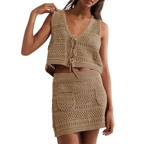 Tão atemporal e perfeito para dias de praia, este lindo conjunto da nossa coleção de saída de praia de crochê será ideal para todas as estações. Mantenha-o coordenado com um conjunto que é perfeito para misturar e combinar. Ajuste relaxado inspirado no colete, decote em V, fechos de gravata na frente, sem forro. A minissaia possui cintura elástica de cintura alta para facilitar o puxão, bolsos caídos - Essenciais: Descubra nossa variedade de saídas de banho femininas, com minissaia de cintura alta, como roupa de praia com costura vazada. A gravata frontal é projetada para ser fácil de colocar e tirar. O conjunto de saída de praia se tornará sua roupa de praia favorita - Design exclusivo: a saída de praia de crochê de 2 peças apresenta malha boho leve, gola V, fecho frontal de amarrar, adicionando um toque de gosto feminino. Nossas saídas de praia femininas não são apenas um conjunto de roupas, são tendências da moda e malhas funcionais - LEVE: tecidos macios e respiráveis com designs transparentes adicionam um toque sexy ao seu visual de verão. Reveladora, mas modesta, nossa saída de banho pode fornecer cobertura enquanto ainda exibe roupas por baixo. Esta blusa cropped feminina sem mangas não só pode ser usada como saída de praia, mas também pode ser usada como uma regata de malha leve de verão - OCASIÃO: Nossos conjuntos de saias de praia femininas de 2 peças são uma combinação de tops sem mangas e mini vestido quente, perfeito para férias na praia. A saída de praia feminina é uma adição definitiva à sua coleção de roupas de banho. Adequado tanto para uso casual, como festas, regresso a casa, sair, praia, férias, viagens, namoro - Dicas quentes: para uso duradouro, recomendamos lavar à mão em água fria, secar na horizontal e evitar alvejante. Basta seguir nossas instruções de cuidados e você poderá usá-lo por muitos anos