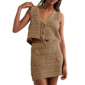Tão atemporal e perfeito para dias de praia, este lindo conjunto da nossa coleção de saída de praia de crochê será ideal para todas as estações. Mantenha-o coordenado com um conjunto que é perfeito para misturar e combinar. Ajuste relaxado inspirado no colete, decote em V, fechos de gravata na frente, sem forro. A minissaia possui cintura elástica de cintura alta para facilitar o puxão, bolsos caídos - Essenciais: Descubra nossa variedade de saídas de banho femininas, com minissaia de cintura alta, como roupa de praia com costura vazada. A gravata frontal é projetada para ser fácil de colocar e tirar. O conjunto de saída de praia se tornará sua roupa de praia favorita - Design exclusivo: a saída de praia de crochê de 2 peças apresenta malha boho leve, gola V, fecho frontal de amarrar, adicionando um toque de gosto feminino. Nossas saídas de praia femininas não são apenas um conjunto de roupas, são tendências da moda e malhas funcionais - LEVE: tecidos macios e respiráveis com designs transparentes adicionam um toque sexy ao seu visual de verão. Reveladora, mas modesta, nossa saída de banho pode fornecer cobertura enquanto ainda exibe roupas por baixo. Esta blusa cropped feminina sem mangas não só pode ser usada como saída de praia, mas também pode ser usada como uma regata de malha leve de verão - OCASIÃO: Nossos conjuntos de saias de praia femininas de 2 peças são uma combinação de tops sem mangas e mini vestido quente, perfeito para férias na praia. A saída de praia feminina é uma adição definitiva à sua coleção de roupas de banho. Adequado tanto para uso casual, como festas, regresso a casa, sair, praia, férias, viagens, namoro - Dicas quentes: para uso duradouro, recomendamos lavar à mão em água fria, secar na horizontal e evitar alvejante. Basta seguir nossas instruções de cuidados e você poderá usá-lo por muitos anos