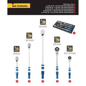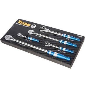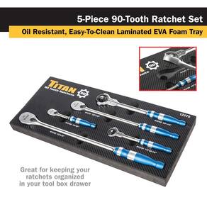 Titan 12175 Conjunto de catraca de cabeça giratória e cabeça chata de 90 dentes, 5 peças - Inclui (2) catracas de alumínio com cabeça giratória e (3) catracas de alumínio de cabeça plana | Atende 150% ANSI | Feito em Taiwan - Catracas de cabeça plana: (1) 1/10.2 cm Dr. x 6 polegadas, (1) 3/8 polegadas Dr. x 12 polegadas e (1) 1/2 polegada Dr. x 16 polegadas - Catracas de cabeça giratória: (1) 1/4 polegada Dr. x 6-1/2 polegadas e (1) 3/8 polegadas Dr. x 10 polegadas - Estrutura de aço cromo-vanádio com acabamento acetinado resistente à corrosão e cabo de alumínio anodizado - O mecanismo de catraca reversível de 90 dentes produz uma varredura mínima de 4 graus; perfeito para uso em áreas confinadas e difíceis de alcançar em compartimentos apertados do motor e outros espaços apertados