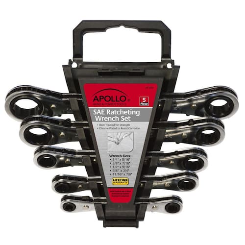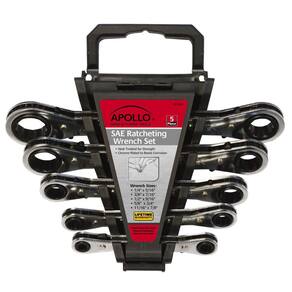 Apollo O conjunto de chaves de catraca de aço SAE de 5 peças TOOLS inclui 5 chaves de catraca em estojo de liberação rápida para porta-malas, garagem e na estrada - DT1212 - Nosso conjunto de chaves de catraca de 5 peças - SAE: Este é o conjunto que você precisa e deseja para aplicações SAE. Nossas chaves de catraca são feitas de liga de aço de alta qualidade tratada termicamente para resistência e durabilidade e cromadas para resistir à corrosão. - Um conjunto de chaves de catraca organizadas sem granel: nosso conjunto de chaves de catraca vem em um prático suporte de transporte que as pessoas adoram. A embalagem mínima e fácil de transportar permite que todas as chaves permaneçam organizadas com acesso rápido sem uma capa volumosa. - Conjunto prático para uso versátil: as chaves de catraca são perfeitas para uso em locais apertados; você sempre terá o tamanho certo para todos os trabalhos rápidos. Este é um ótimo conjunto de chaves inglesas de alta qualidade a um preço excepcional. É perfeita para manter no seu carro para emergências e é uma ótima ideia de presente. - Tamanhos mais necessários: Selecionamos os tamanhos que acreditamos que você precisará com mais frequência: chaves de catraca de 1/4 polegadas por 5/16 polegadas, 3/8 polegadas por 7/16 polegadas, 1/2 polegada por 9/16 polegadas, 5/8 polegadas por 3/4 polegadas, 11/16 polegadas por 7/8 polegadas. - APOLLO Garantia de qualidade vitalícia da ferramenta manual: cada ferramenta é testada de acordo com os padrões da indústria quanto à dureza, torque, acabamento e usabilidade e deve durar uma vida inteira sob uso normal.