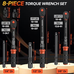 - Conjunto de chaves de torque 3 em 1 com acessórios?O conjunto de chaves de torque Matework inclui chaves de torque de 1/10.2 cm (10-220 lbf·in), 3/20.3 cm (10-45 lbf·pés) e chaves de torque de 1/5.1 cm (10-160 lbf), juntamente com 3 barras de extensão (10-160 lbf). 2 mm 12,7 cm, 15,2 cm), um adaptador de 1/2 a 3/8 e uma junta universal de 3/8. Perfeito para uma ampla variedade de aplicações de torque, desde pequenos reparos de bicicletas até manutenção automotiva pesada