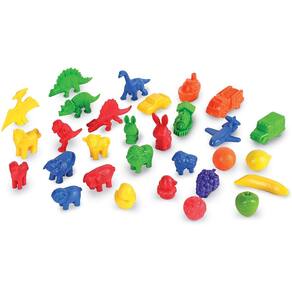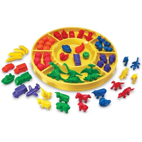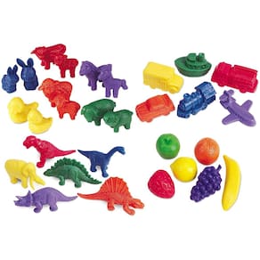As crianças aprenderão a contar e classificar com este conjunto abrangente de contadores divertidos e duráveis. O conjunto inclui 48 Mini Dino Counters, 36 Fruity Fun Counters, 36 Mini Motors Counters e 48 Friendly Farm Animal Counters. A bandeja de classificação foi vendida separadamente.