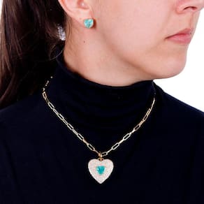 Conjunto composto de colar e um par de brincos com pingente em formato de coração, banhado a ouro com pedras fusion e microzircônias cristais. É luxuoso que te deixa em destaque em qualquer situação.