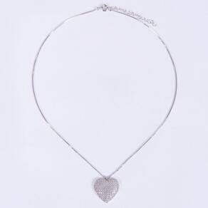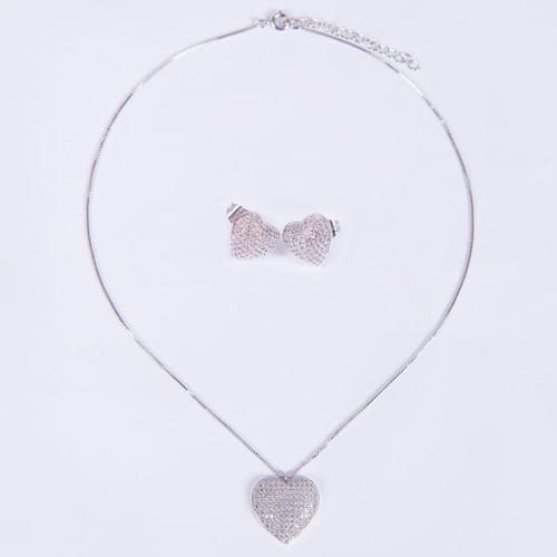 O Conjunto composto de colar em malha com pingente e brincos em formato de coração cravejado de microzircônias cristais, em ródio branco, delicado e luxuoso que lhe deixa em destaque em qualquer situação.