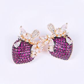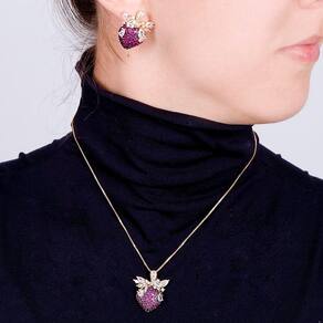 Conjunto composto de colar com pingente e brincos em formato de morangos, banhados a ouro cravejados de microzircônias cristais e coloridas. É delicado e luxuoso que te deixa em destaque em qualquer situação.