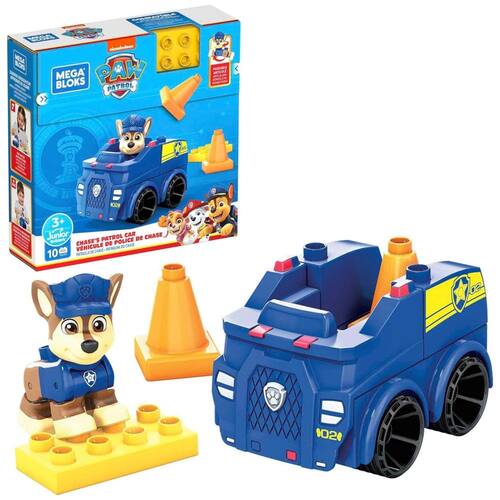 O conjunto de construção Chases Patrol Car é um brinquedo de construção projetado para crianças a partir dos 3 anos de idade. Ele vem com 1 figura articulável do Chase e 10 miniblocos de construção, incluindo peças especiais, que são duráveis e fáceis de montar. As crianças podem construir o carro patrulha do Chase e colocá lo dentro para se preparar para a ação. Além disso, os cones dos postes podem ser colocados ao redor da cidade para ajudar a salvar o dia. Quando a missão estiver concluída, os cones do poste podem ser empilhados na parte traseira do carro patrulha. Este conjunto de construção é compatível com todos os conjuntos de construção PAW Patrol, brinquedos de construção MEGA BLOKS e outras marcas.