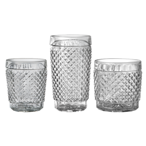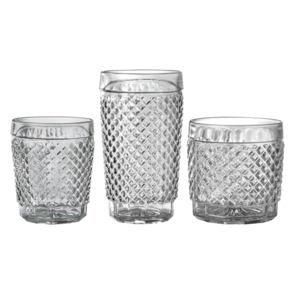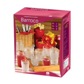 Conjunto com 18 copos de vidro transparente da linha Barroco da Wheaton. Este conjunto variado é composto por 6 copos para água, 6 copos On The Rocks (ideal para whisky e drinks) e 6 copos para aperitivo. Apresentam o clássico design "bico de jaca" da linha Barroco, combinando com diversos momentos e estilos de mesa. É uma opção completa e versátil para servir diferentes tipos de bebidas.