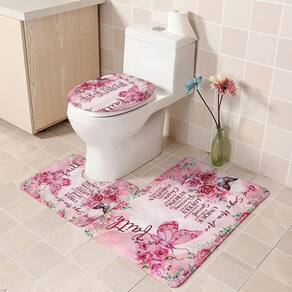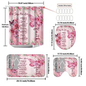 Tamanho do tapete antiderrapante: 45* 38 cm; tamanho do tapete de banho: 45* 74 cm; tamanho do assento do vaso sanitário: 35* 45 cm; tamanho da cortina de chuveiro: 180* 180 cm; peso: 800 g; material: poliéster; cor: igual à primeira foto; pacote: 1 tapete antiderrapante, 1 tapete antiderrapante de banheiro, 1 x assento sanitário, 1 x cortina de chuveiro • Design elegante de borboleta e rosa: este lindo chuveiro A cortina apresenta uma borboleta delicada cercada por rosas cor de rosa e versículos bíblicos inspiradores, adicionando uma atmosfera pacífica e revigorante ao seu banheiro. • Poliéster impermeável durável: feita de poliéster de alta qualidade, esta cortina é impermeável e duradouro, garantindo que seu banheiro permaneça seco, mantendo suas cores vibrantes. • Conjunto completo de 4 peças: inclui cortina de chuveiro, tapete de banho antiderrapante, tampa de vaso sanitário e tapete de contorno, oferecendo uma aparência coordenada e elegante à decoração do banheiro. • Suporte antiderrapante: tanto o tapete quanto os tapetes possuem um suporte antiderrapante, proporcionando maior segurança e estabilidade em pisos úmidos do banheiro. • Fácil instalação e cuidado: Este conjunto é fácil de instalar com os ganchos incluídos, e a cortina e os tapetes são laváveis à máquina para facilitar a limpeza e manutenção.