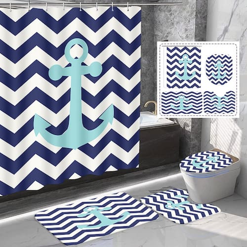 Tamanho do tapete antiderrapante: 45* 39 cm; tamanho do tapete de banho: 75* 45 cm; tamanho do assento do vaso sanitário: 38* 42 cm; tamanho da cortina de chuveiro: 180* 180 cm; peso: 800 g; material: poliéster; cor: igual à primeira foto; pacote: 1 x tapete antiderrapante, 1 x tapete antiderrapante de banheiro, 1 x assento de vaso sanitário, 1 x cortina de chuveiro (cor igual à imagem principal) Este tapete náutico O conjunto de cortinas de chuveiro temático apresenta um ousado padrão chevron azul e branco com um design de âncora central, trazendo uma aparência elegante e de inspiração marinha à decoração do seu banheiro. Feita de tecido de poliéster durável e resistente à água, a cortina de chuveiro é fácil de limpar, mantendo suas cores vibrantes e garantindo que seu banheiro permaneça seco e fresco. O conjunto inclui uma cortina de chuveiro (180x180cm), uma tampa de vaso sanitário (38x42cm) e dois tapetes de banho antiderrapantes (75x45cm e 45x39cm), proporcionando cobertura completa do banheiro e conforto. Perfeito para adicionar uma atmosfera costeira e descontraída ao seu banheiro, este conjunto é ideal para amantes da praia ou para quem procura um tema náutico fresco em sua casa. Os tapetes de banheiro e a tampa da tampa do vaso sanitário apresentam o mesmo padrão de âncora e chevron, aprimorando o design coordenado do espaço do banheiro com estilo e função.