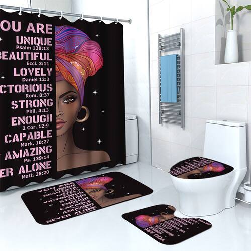 Tamanho do tapete antiderrapante: 45* 38 cm; tamanho do tapete de banho: 74* 45 cm; tamanho do assento do vaso sanitário: 35* 45 cm; tamanho da cortina de chuveiro: 180* 180 cm; peso: 700 g; material: poliéster; cor: igual à primeira foto; pacote: 1 tapete antiderrapante, 1 tapete antiderrapante de banheiro, 1 x assento de vaso sanitário, 1 x cortina de chuveiro Material de poliéster durável: feito de tecido de poliéster de qualidade que oferece cortina lisa, desempenho de secagem rápida e proteção confiável à prova d'água para uso diário no banheiro. Design artístico arrojado: apresenta uma impressionante ilustração feminina africana com um lenço colorido e texto afirmativo, adicionando caráter e personalidade modernos à decoração do banheiro. Conjunto funcional de 4 peças: inclui uma cortina de chuveiro de 180 × 180 cm, tapete antiderrapante, tapete de banho e tampa de vaso sanitário, projetado para combinar uma configuração de banheiro coesa e elegante. Suporte antiderrapante: Ambos os tapetes possuem suporte antiderrapante para ajudar a reduzir o deslizamento em superfícies secas, oferecendo mais estabilidade durante as rotinas diárias. Fácil instalação e manutenção: vem com ganchos para uma configuração simples, e o tecido de poliéster é fácil de limpar e manter, ideal para apartamentos, dormitórios e banheiros domésticos.