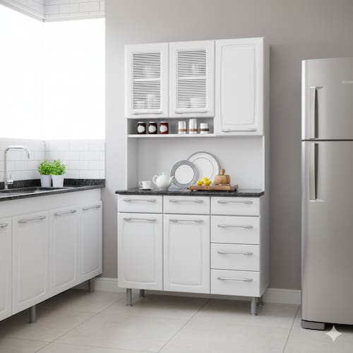 Com nichos bem distribuídos, esta cozinha Itatiaia vai garantir que você mantenha utensílios domésticos, eletroportáteis e até objetos decorativos sempre organizados. Ao todo, são 6 portas, sendo duas de vidro serigrafado, 3 gavetas e 1 nicho. Destaque para o tampo de MDP 25mm com acabamento em Baixa Pressão (BP) e revestimento na cor granito.