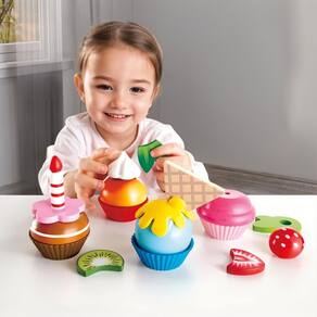 - Cupcakes fofos e doces: hora de um doce! Faça suas próprias criações de cupcakes com este conjunto de brinquedo de cozinha de 18 peças com quatro cupcakes e uma variedade de coberturas espetaculares, incluindo uma vela, frutas e uma bolacha