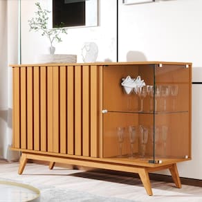 O design elegante une MDF e MDP de alta qualidade, vidro 4 mm e pés em madeira maciça, trazendo charme e durabilidade.