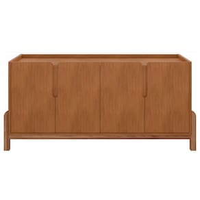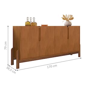 O Buffet é feito em MDP/MDF. Possui 4 portas em MDF usinados com detalhes curvos e 2 prateleiras.