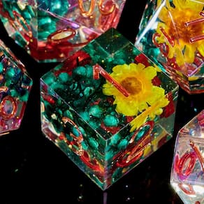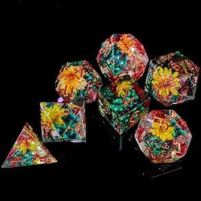 DND Shiny Star & Flowers, conjunto de dados DND feito à mão com 7 acessórios Sharp Edge Dice para jogos TTRPG de Dungeons and Dragons, RPG multifacetado, resina poliédrica, jogos de RPG Sharp Edge Dice - ??RESINA NATURAL FEITA À MÃO?Contém 7 unidades de dados por conjunto, inclui caixa de presente, D4, D6, D8, D10, D12, D20 e D%. Todos feitos à mão com qualidade premium garantida. - ??SHARP EDGE DICE?Cada dado afiado de resina é lixado e polido manualmente para manter suas belas bordas afiadas. - ??FÁCIL DE LER?Preenchido com resina natural. Apresentado de forma cristalina por fora e por dentro, com números grandes e fáceis de ler, o tamanho é um padrão comum de dados de D&D no mercado. - ??MULTIUSO?perfeito para jogos de RPG e MTG, como Dungeons and Dragons, Savage World, Warhammer, Yahtzee e Pathfinder. - ??COMPROMISSO DE SATISFAÇÃO?Garantimos a qualidade de nossos produtos. Se por algum motivo você não estiver satisfeito com sua compra. Nós devolvemos o dinheiro em 90 dias.