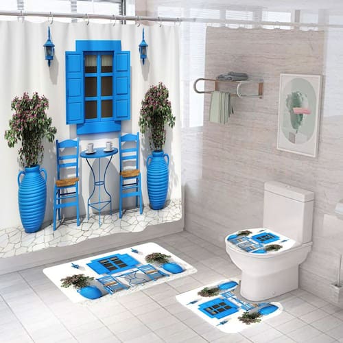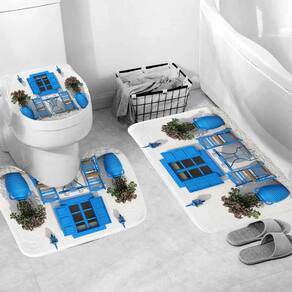 Tamanho do tapete antiderrapante: 45* 39 cm; tamanho do tapete de banho: 75* 45 cm; tamanho do assento do vaso sanitário: 38* 42 cm; tamanho da cortina de chuveiro: 180* 180 cm; peso: 800 g; material: poliéster; cor: igual à primeira foto; pacote: 1 x tapete antiderrapante, 1 x tapete antiderrapante de banheiro, 1 x assento de vaso sanitário, 1 x cortina de chuveiro de inspiração mediterrânea — apresenta um azul brilhante janela, cadeiras de pátio e vasos de flores que trazem uma atmosfera costeira refrescante a qualquer ambiente de banheiro. Tecido de poliéster durável — Feito de poliéster macio e resistente ao desbotamento que mantém as cores vivas e proporciona um desempenho diário duradouro. Conjunto completo de decoração de banheiro de 4 peças — Inclui uma cortina de chuveiro à prova d'água, tapete antiderrapante, tapete em forma de U e tampa de vaso sanitário, oferecendo uma atualização de quarto coordenada e charmosa. Tapetes antiderrapantes e absorventes — O suporte antiderrapante melhora a aderência ao piso e ajuda a manter os tapetes firmemente no lugar, ao mesmo tempo que absorve a umidade de forma eficaz. Fácil instalação e cuidado — Os ilhós reforçados permitem pendurar rapidamente na maioria dos varões de chuveiro padrão; tanto as cortinas quanto os tapetes são fáceis de limpar e manter.