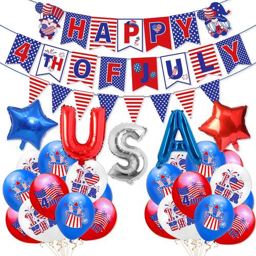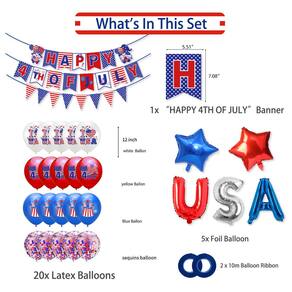 Conjunto completo de 4 de julho: inclui faixas de letras e triângulos, 18 balões de látex impressos, 5 balões de alumínio e 2 fitas azuis para facilitar a decoração. Materiais de qualidade premium: feitos de látex, papel alumínio e papel duráveis, seguros, não tóxicos e reutilizáveis para várias celebrações patrióticas. Cores vibrantes de vermelho, branco e azul: os tons clássicos da bandeira americana criam uma atmosfera festiva e patriótica perfeita para eventos do Dia da Independência. Fácil de montar: leve e simples de pendurar em ambientes internos ou externos para festas, desfiles, churrascos e reuniões comunitárias. Decoração patriótica perfeita: ideal para celebrações do Dia Nacional, decorações de escritório ou casa e cenários de cabines fotográficas para momentos memoráveis.