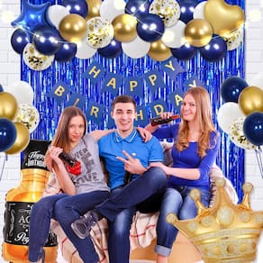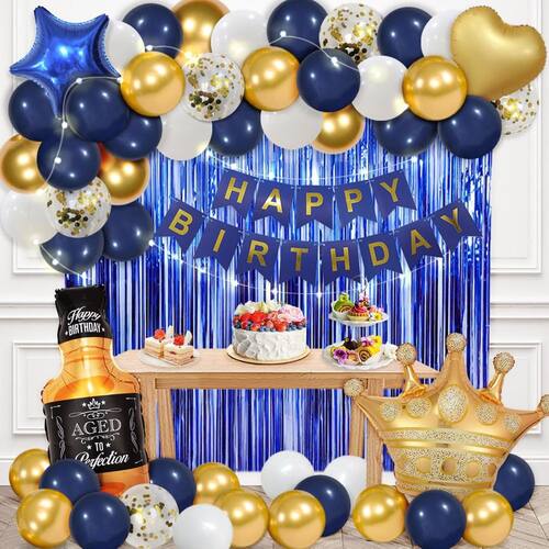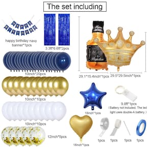 Este conjunto de decoração de aniversário inclui tudo o que você precisa: faixa, balões, cortinas, luzes LED e todos os tipos de ferramentas. - Decoração de festa de aniversário: este conjunto de decoração de aniversário inclui tudo o que você precisa: faixa, balões, cortinas, luzes LED e todos os tipos de ferramentas. Há também 6 cores temáticas que você pode escolher. E tudo o que você precisa é de 2 pilhas AA para sua festa de aniversário - O pacote inclui: 1 faixa de feliz aniversário, 2 peças de cortinas de alumínio de 1 m x 2 m, 1 balão de garrafa de uísque, 1 balão de coroa de ouro, 1 estrela marinha de 45 cm, 1 coração dourado de 45 cm, 40 balões de látex de 25 cm (marinho, dourado, branco), 5 peças confusas de 30 cm balões etti, 1 peça Luzes LED de 3 metros, 1 corrente de balão, 1 ponto de cola, 1 canudo, 1 fita - Sobre os materiais: Os artigos de festa são feitos de materiais amigáveis. Os balões são duradouros e coloridos - Fácil de montar: o conjunto vem com corrente de balão, cola de pontos, fita e canudo. Essas ferramentas podem ser usadas para inflar o balão e configurar o local da festa de aniversário rapidamente. Tire mais fotos bonitas, será uma ótima lembrança de festa para você - Ocasião: Adequado para todos os tipos de festas, decoração de quarto, celebrações