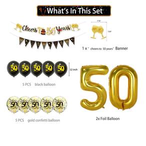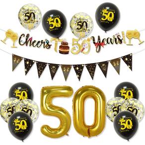 Conjunto completo de 50 anos: este conjunto de balões pretos e dourados apresenta balões numéricos de 32", uma faixa “Cheers to 50", balões de látex de confete pretos e dourados e bandeirolas triangulares adicionais para uma celebração deslumbrante. Materiais duráveis e de alta qualidade: feitos de látex e papel alumínio premium, esses balões são projetados para uma decoração duradoura, criando uma atmosfera vibrante e festiva para seu dia especial. Tema elegante em preto e dourado: o design elegante em preto e dourado, combinado com chamativos balões de confete, define um tom sofisticado para uma memorável festa de 50 anos ou aniversário. Configuração fácil: inclui acessórios como pontos de cola e anéis de balão, simplificando a montagem da decoração da festa e aproveitando mais o tempo com seus convidados. Perfeito para comemorações marcantes: ideal para aniversários de 50 anos, aniversários e outras celebrações marcantes, este conjunto adiciona um toque extra de classe e emoção ao seu evento.