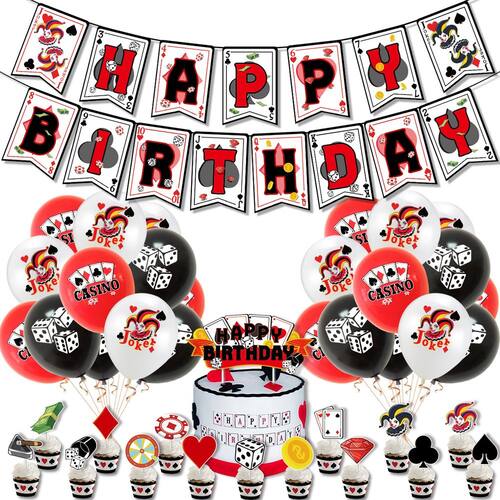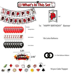 Conjunto de festas temáticas de cassino: este conjunto de decoração completo apresenta um divertido tema de pôquer com um banner de “Feliz Aniversário”, balões de baralho, coberturas de bolo e muito mais, ideal para festas de aniversário com tema de cassino ou pôquer. Materiais de látex e papel de alta qualidade: feitos de látex durável e cartolina resistente, os balões e as decorações são projetados para durar durante todo o evento e criar uma experiência memorável para seus convidados. Decorações versáteis e divertidas: o conjunto inclui 18 balões (6 vermelhos, 6 brancos, 6 pretos) e 16 garfos de bolo, perfeitos para criar uma atmosfera de cassino. As cores e os designs ousados com temas de pôquer adicionarão emoção à sua festa. Perfeito para noites de pôquer e cassino: se você está organizando uma noite de pôquer, festa de aniversário ou evento temático de cassino, este conjunto dá o toque definitivo à sua decoração e ajuda a criar uma atmosfera divertida e animada. Fácil de configurar: com uma variedade de decorações, como faixas, balões, coberturas de bolo e fitas, decorar sua festa é rápido e fácil, para que você possa se concentrar em se divertir com seus convidados.