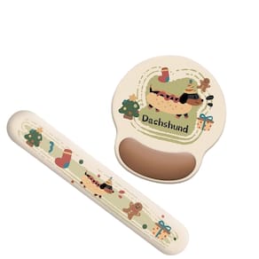 Material: tecido de seda leitosa + silicone + PU Tamanho: mouse pad 25,3* 23* 2 cm; bandeja de teclado 44* 8 cm Peso: 350 g Design ergonômico confortável — inclui um mouse pad de 253 × 230 × 20 mm e apoio de pulso para teclado de 440 × 80 mm que fornecem suporte total para pulso e braço para reduzir a tensão durante longas sessões de digitação ou navegação. Almofada de silicone macio — O acolchoamento de silicone de alta qualidade combinado com tecido de seda leitosa oferece um toque suave e confortável, garantindo excelente conforto e flexibilidade no pulso. Adorável tema de dachshund — apresenta um cachorro-salsicha brincalhão em estilo natalino cercado por árvores, presentes e padrões de pão de gengibre, trazendo uma atmosfera festiva e aconchegante à sua mesa. Base de PU antiderrapante — O suporte antiderrapante mantém o mouse pad e a pulseira do teclado firmemente no lugar, evitando movimentos indesejados para uma experiência de trabalho estável. Durável e fácil de limpar — A superfície macia e resistente ao desgaste é fácil de manter e adequada para uso doméstico, no escritório ou no laptop, tornando-a ideal para o conforto e o estilo do dia a dia.
