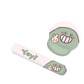 Material: silicone e espuma viscoelástica Tamanho: mouse pad 227* 118* 17,5 mm; bandeja de teclado 440* 75 mm Peso: 350 g Suporte ergonômico de pulso: possui uma almofada curva de espuma viscoelástica que apoia seus pulsos e promove uma posição natural das mãos para reduzir a fadiga durante longas sessões de computador. Materiais altamente elásticos: feitos com silicone premium e espuma viscoelástica macia para conforto excepcional, recuperação e durabilidade duradoura. Design divertido de desenho animado: adorável carinha verde sorridente e “Yay!” A impressão adiciona personalidade divertida e frescor ao seu espaço de trabalho, perfeita para ambientes de estudo ou escritório. Base antiderrapante estável: a parte inferior de silicone antiderrapante mantém o mouse pad e o apoio de pulso firmemente no lugar para um movimento suave e ininterrupto. Conjunto compacto e prático: inclui um mouse pad de 227 x 118 x 17,5 mm e um suporte para teclado de 440 x 75 mm, leve (350 g) e fácil de limpar — ideal para uso no escritório, em casa ou no laptop.