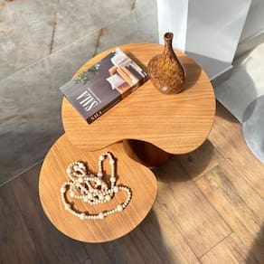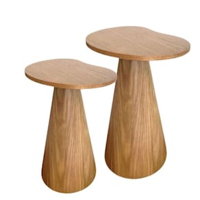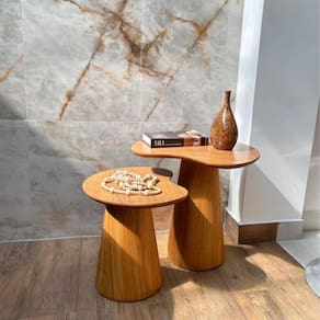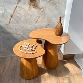Mesa Lateral Orgânica Redonda, Tampo 51 cm em MDF Melamina Madeira Freijó, Base em MDF Flexivel Laminada em Madeira Freijó.