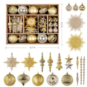 SHareconn Conjunto de 80 peças de enfeites de bolas de Natal, conjunto de presente de luxo leve contemporâneo, decoração de plástico inquebrável para árvore de Natal, decorações de festa de casamento com cordas para pendurar, ouro escuro e claro - ?Exclusivamente bonito?Nosso conjunto de enfeites de Natal apresenta uma variedade de formas e acabamentos. Alegre-se com uma coleção atraente que adiciona profundidade e riqueza à decoração de suas férias. - ?Configuração sem esforço?Pendure 80 ornamentos num instante com os cordões pré-amarrados incluídos. Experimente o corte de árvores sem complicações com nosso conjunto fácil de usar e resultados brilhantes. - ?Inquebrável?Nossos ornamentos grandes são feitos de material durável, de alta qualidade e inquebrável, feito para durar inúmeras temporadas de férias. Deixe crianças e animais de estimação participarem de toda a diversão festiva sem a preocupação de enfeites quebrados. - ?Tela versátil?Perfeitamente adequado para árvores de Natal, casamentos, festas ou qualquer ocasião especial. Nosso conjunto adiciona o toque final perfeito a qualquer exibição interna ou externa. - Atmosfera encantadora: nossas decorações requintadas transformam sua casa em um convidativo país das maravilhas do inverno. Ideal para pendurar em galhos de árvores, paredes, guirlandas e muito mais, espalhar a alegria do feriado nunca foi tão fácil!