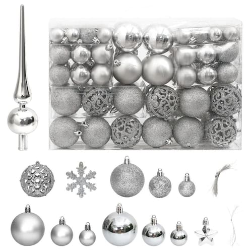 Este conjunto de enfeites de Natal de 111 peças oferece uma coleção requintada de ornamentos com design elegante para transformar suas decorações natalinas. Perfeito para adicionar um toque festivo à árvore da sua sala de estar, seus elegantes tons de prata criam uma atmosfera encantadora de inverno, convidando calor e alegria para sua casa durante esta estação maravilhosa