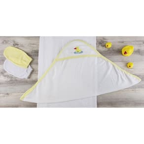 Conjunto de enxoval Bambini perfeito para qualquer bebê recém-nascido, feito de roupas de bebê de algodão macio e aconchegante, mantendo os pequenos confortáveis. Este conjunto é o presente de chá de bebê perfeito para qualquer futura mamãe! Feito de tecido de algodão macio para maior conforto e respirabilidade. O decote de ombro expansível ajuda a puxar a roupa sobre a cabeça do bebê com muito mais facilidade. A abertura canelada da perna é perfeita para lavar e secar na máquina. Toalha felpuda com capuz felpudo com estampas de tela (80% algodão/ 20% poliéster), luva de pano de banho, fundo da imagem e adereços não incluídos. Roupas de bebê para cada recém-nascido que precisa de roupas.