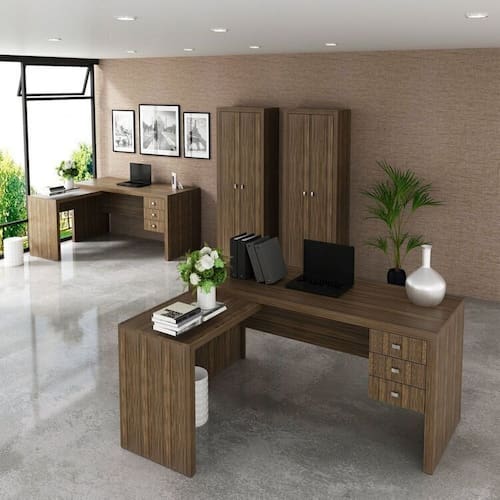 Os produtos são fabricados em MDP, um material muito resistente e de alta durabilidade, que garante excelente estabilidade e resistência. Possuem revestimento em BP Brilhante, um acabamento melamínico em baixa pressão. Esse revestimento, também conhecido como BP, confere maior resistência e durabilidade aos produtos, sendo mais resistente a riscos e à umidade, e não descasca. Acabamento: BP Altura do Conjunto: 171.5 cm Ambiente: Escritório Ambiente Principal: Escritório Cor: Nogal Informação Complementar: 2x Mesa para Escritório em L com 3 Gavetas Me4106 Nogal Largura: 154,8 cm Altura: 74,6 cm Peso: 40,5 kg Profundidade: 46,5 cm Necessita Montagem: Sim
