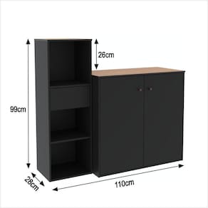 Altura do Armário (cm): 99cm | Altura do Aparador (cm): 74cm | Largura do Armário (cm): 33cm | Largura do Aparador (cm): 77cm | Profundidade do Armário (cm): 28cm | Profundidade do Aparador (cm): 38cm | Altura dos Pés (cm): Não se aplica | Ambiente Principal: Escritório | Complexidade da Montagem: Média: pode ser montado por mais de uma pessoa e/ou necessite de maior conhecimento para montagem | Cor do Produto: Off White/Cedro | Cor Predominante: Off White | Cor Interna: Off White | Acabamento: Pintura UV | Acabamento da Gaveta: Pintura UV | Acabamento dos Pés: PVC | Possui Nichos: Sim | Escala de Brilho: Fosco | Escala de Brilho da Gaveta: Fosco | Possui Rodízio: Não | Garantia: 3 meses | Bandeja: Não | Estilo: Moderno | Itens Inclusos: 1 Aparador, 1 Armário, Manual de Montagem e Kits de Montagem | Linha ou Coleção: Tech | Inclui manual de montagem: Sim | Marca: ViaNossa | Material da Gaveta: MDP/MDF | Material dos Pés: PVC | Material Principal: MDP/MDF | Necessita Montagem: Sim | Origem do Produto: | Cor: Preto e Cedro