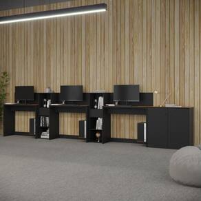 O Conjunto de Escritório Tech é compacto e funcional, ideal para ambientes profissionais e home office. Contando com sua Escrivaninha com passa fios e suporte para CPU, Buffet Aparador com 2 Portas e dobradiças metálicas e o Armário é compacto e funcional, com 3 nichos e 1 gaveta. Todos com tampo em MDF usinado e sapatas de PVC, unindo design moderno e praticidade. Confira a linha Tech completa em nossos anúncios e transforme seu espaço com inteligência e estilo!